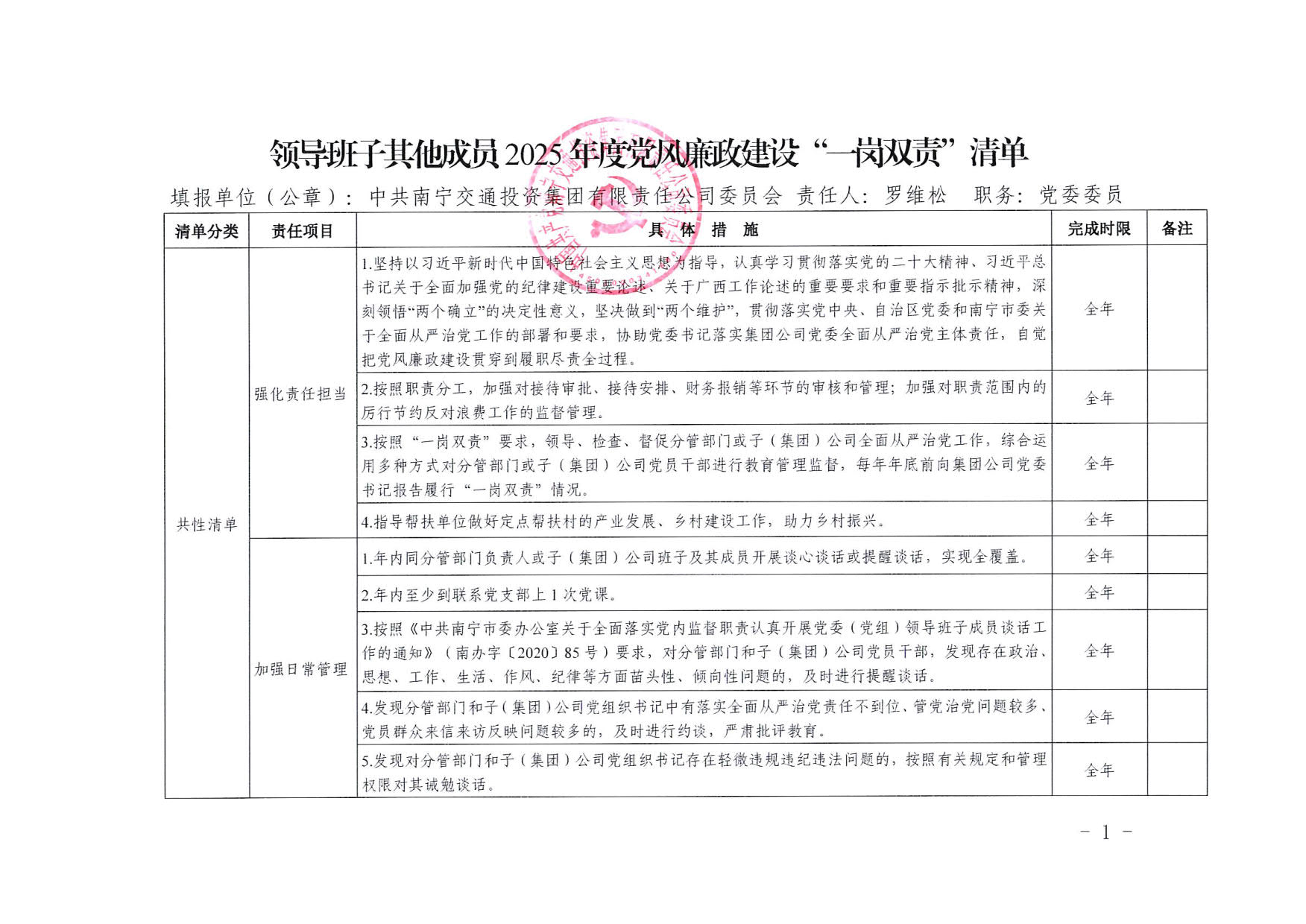 南寧交投集團(tuán)領(lǐng)導(dǎo)班子其他成員2025年度黨風(fēng)廉政建設(shè)“一崗雙責(zé)”清單(五)
