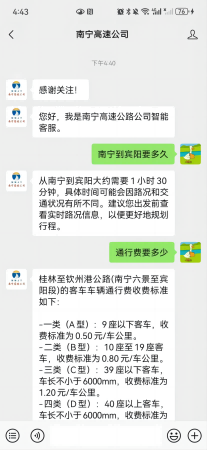 司乘只需關注“南寧高速公司”微信公眾號,點擊發(fā)消息即可輕松開啟在線咨詢之旅。這種將AI智能客服融入微信公眾號的方式,充分考慮了司乘人員的使用習慣,進一步拉近了企業(yè)與司乘之間的距離。